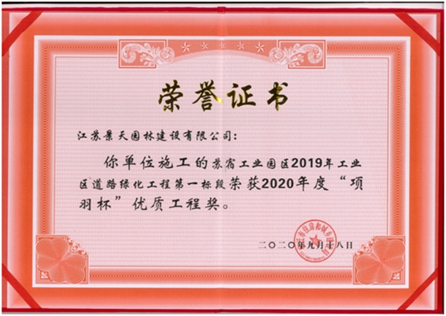 蘇宿工業(yè)園區(qū)2019年工業(yè)區(qū)道路綠化工程榮獲2020年度“項羽杯”優(yōu)質(zhì)工程獎