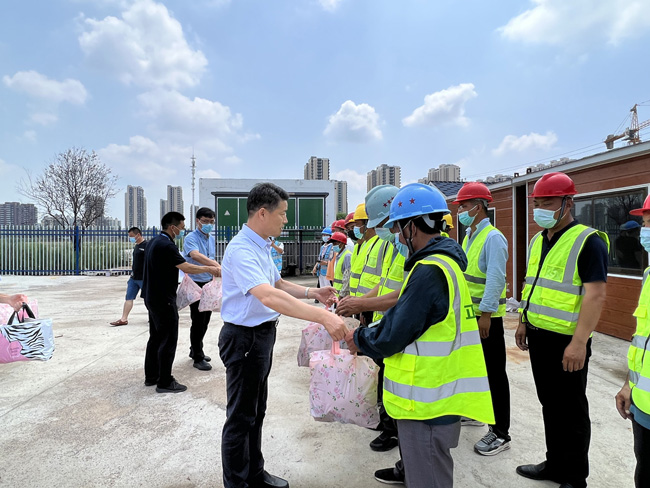 為切實(shí)維護(hù)高溫期間建筑工人身體健康,保障建筑工人在生產(chǎn)過(guò)程中的安全與健康,切實(shí)做好安全文明施工,確保工程項(xiàng)目順利推進(jìn)。7月1日上午,總經(jīng)理劉建華帶隊(duì)慰問建設(shè)工程施工現(xiàn)場(chǎng)工人,給他們送去毛巾、香皂、洗發(fā)水等防暑降溫用品,感謝他們對(duì)園區(qū)工程建設(shè)作出的貢獻(xiàn)。