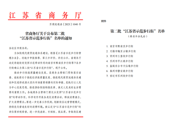 此次評定工作是根據(jù)《江蘇省示范步行街管理辦法》,由江蘇省商務廳集中組織第三方專家和評審員驗收,先后經(jīng)過上報資料、專家審核、實地考察、全省評比等方式確定7條江蘇省示范街區(qū)步行街。