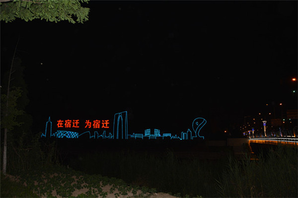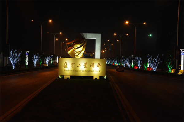 在園區(qū)東入口為民河的一畔,一座座生動的城市剪影燈光造型在青海湖西路兩側一字排開。有象征著新加坡元素的“魚尾獅”,有蘇州工業(yè)園區(qū)金雞湖畔的東方之門、摩天輪和李公堤,還有西楚霸王項羽騎馬的颯爽英姿。造型以蘇州、宿遷和新加坡城市建筑輪廓線、城市主題雕塑為基本元素,以剪影形式為載體,以現(xiàn)代高科技LED燈光為表現(xiàn)手段,通過炫麗動感的光影效果,在夜色中描繪出了一副靚麗多姿的畫卷,生動地展現(xiàn)出了園區(qū)“從新加坡到蘇州再到宿遷”和“在宿遷、為宿遷”的發(fā)展理念。