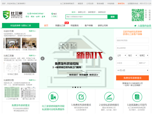 比三家裝修網于2015年10月份落戶蘇宿電子商務產業(yè)園,該裝修網定位于“互聯(lián)網+”大眾創(chuàng)業(yè)平臺,是一家扎根于三線城市,以“中介生意”模式幫助傳統(tǒng)的裝修行業(yè)的公司利用互聯(lián)網接到更多的訂單,幫助用戶找到合適的裝修公司。網站通過好品質裝修,比設計方案、比施工質量、比裝修價格,為用戶提供符合比三家裝修網標準的服務。
