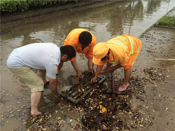 市政搶險疏通小組迅速調(diào)集人員及物資力量,開展區(qū)內(nèi)泄洪及排水工作。公舍等項(xiàng)目為迅速排澇,員工在水中冒雨架好水泵,安裝吸水管,鋪設(shè)排水水帶,發(fā)動機(jī)器快速排水,使公舍車庫等水位快速下降。